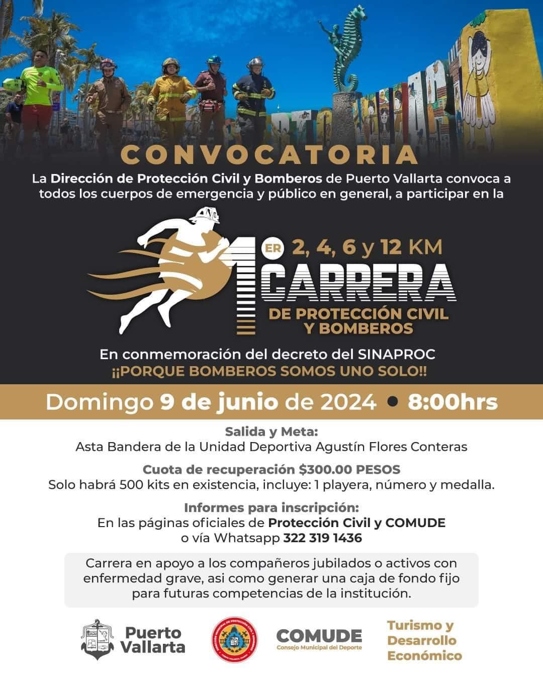 El gobierno municipal de Puerto Vallarta convoca a todos los cuerpos de emergencia y a la población en general a participar en la ‘1ª Carrera de Protección Civil y Bomberos’, que se llevará a cabo el domingo 9 de junio con el propósito de sumarse a la celebración de la creación del Sistema Nacional de Protección Civil (SINAPROC), ocurrida hace 38 años.