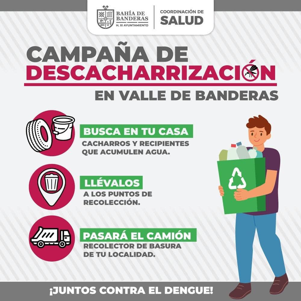 Bahía de Banderas, Nay., a 20 de mayo de 2024.- Este martes 21 de mayo, personal de la Dirección de Salud estará pasando por las calles de la localidad de Valle de Banderas y Tapachula, con el objetivo de llevarse los cacharros que los vecinos saquen a la vía pública y así erradicar los criaderos de larvas mosquito.