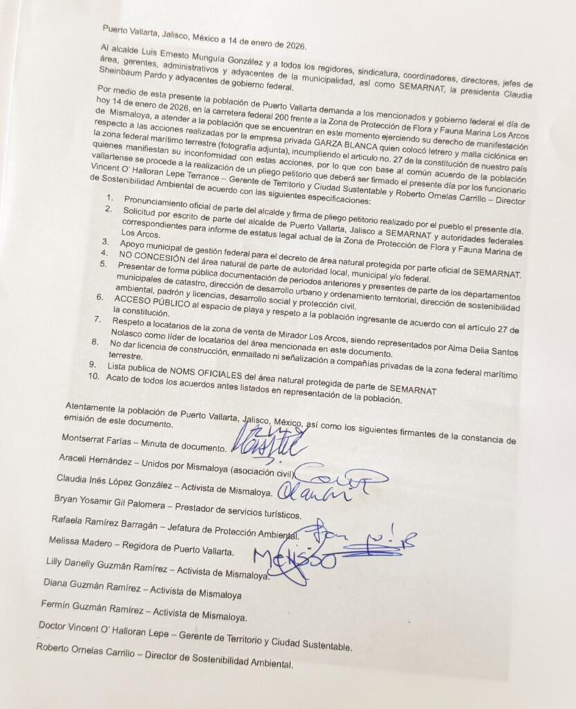 El documento exige, entre otros puntos, un pronunciamiento oficial del gobierno municipal sobre lo ocurrido; la solicitud formal a SEMARNAT para informar el estatus legal actual de la zona de Los Arcos; y el respaldo del Ayuntamiento para gestionar su decreto como Área Natural Protegida de carácter federal.